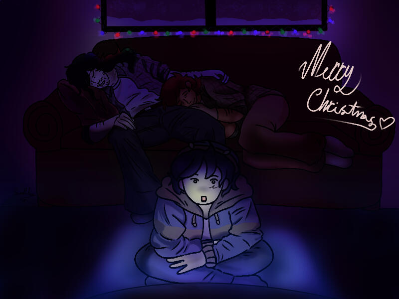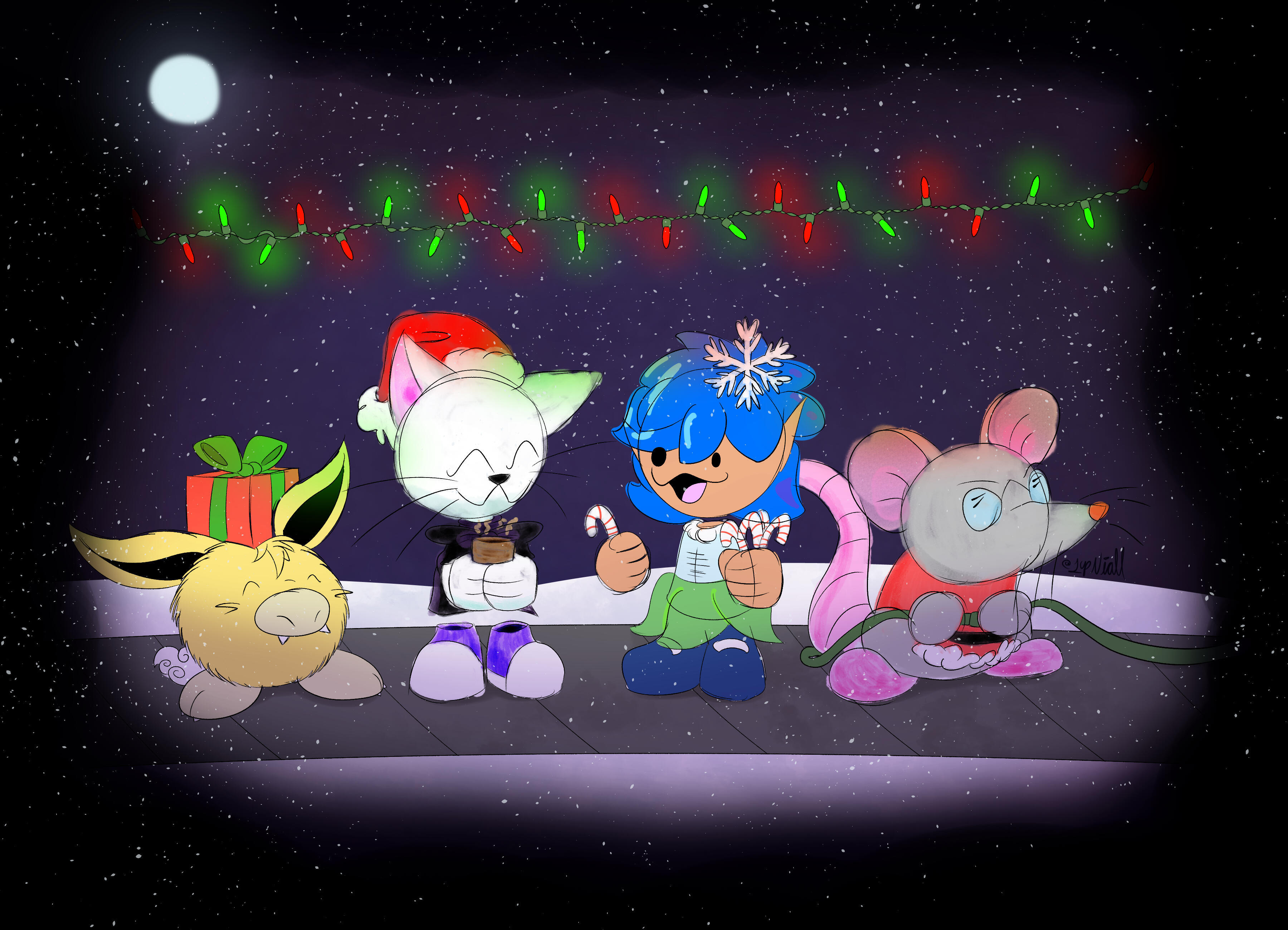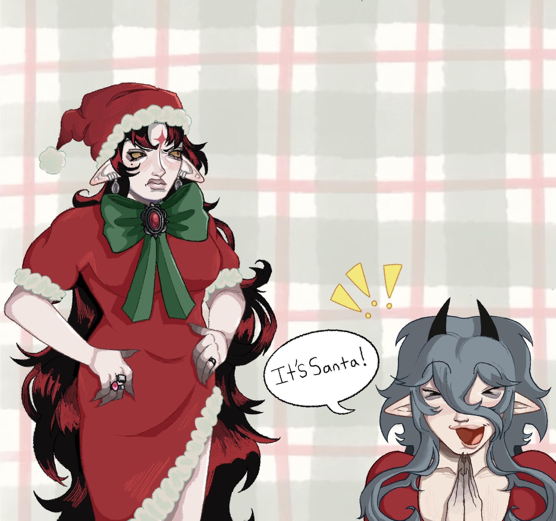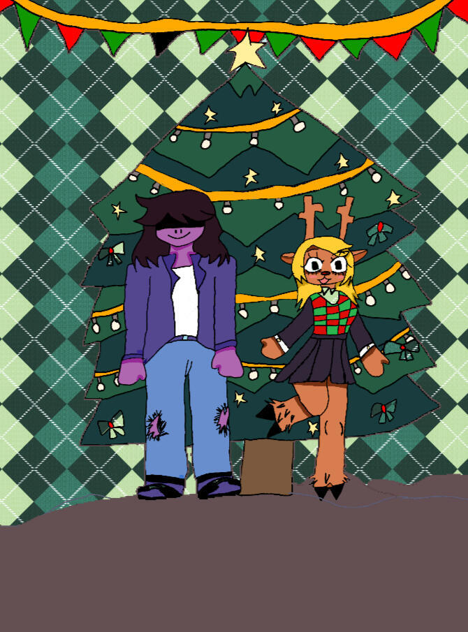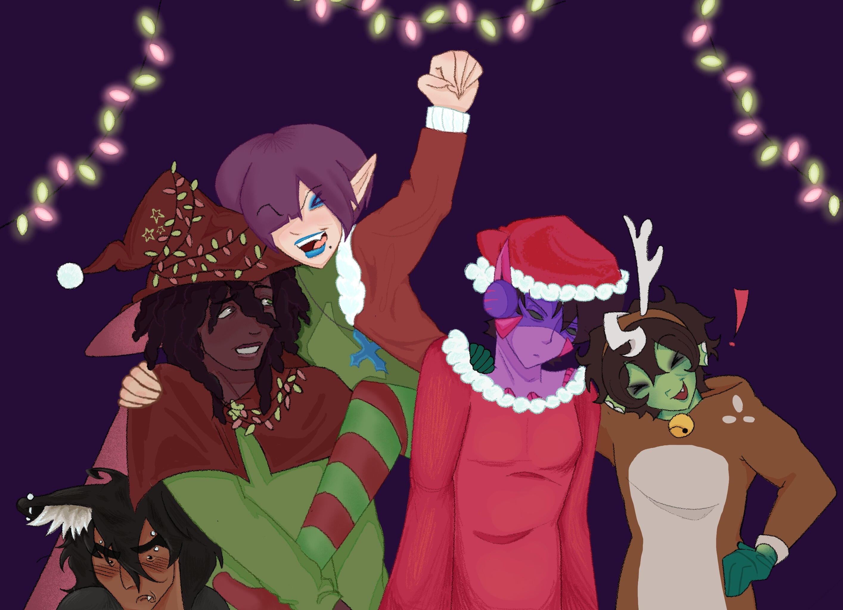 A drawing of my ocs sitting by a fire or a tree, one of my favorite characters in something normally worn on Christmas (Santa hat, sweater etc.)
