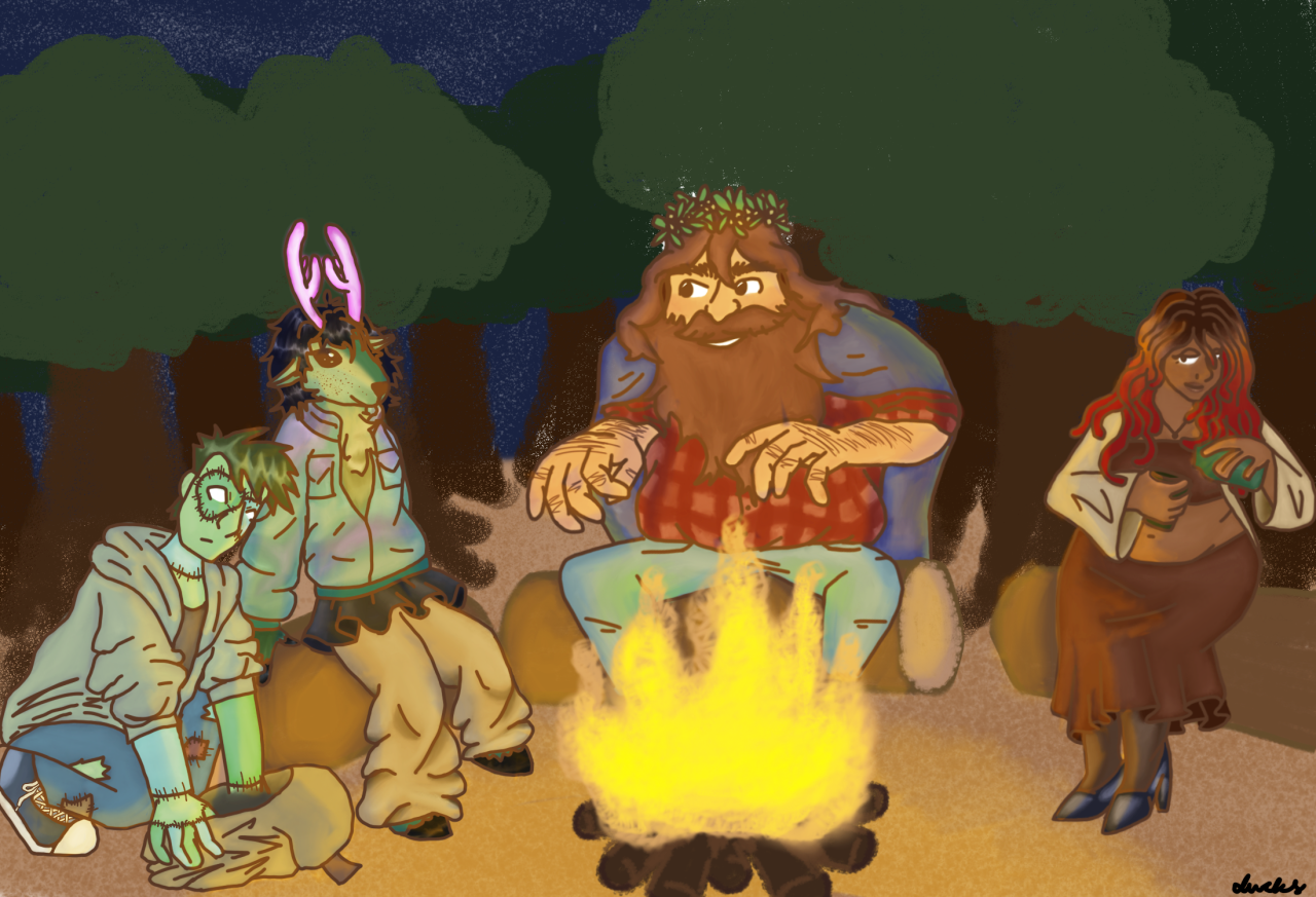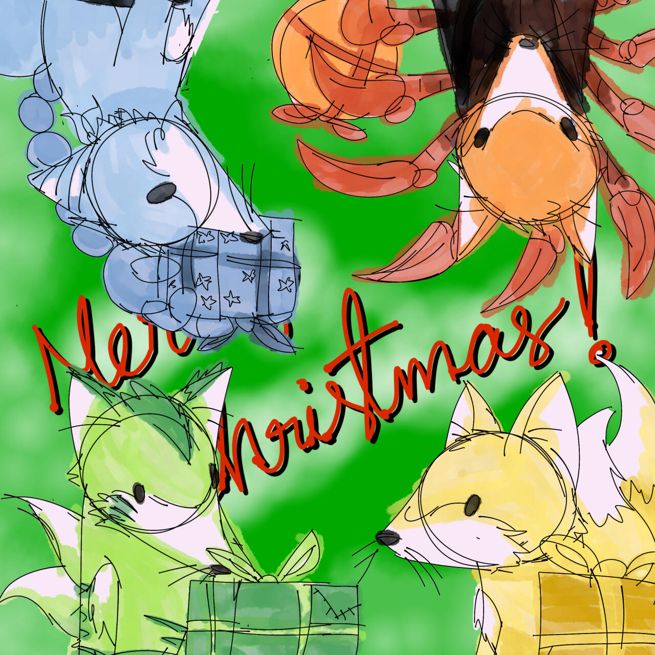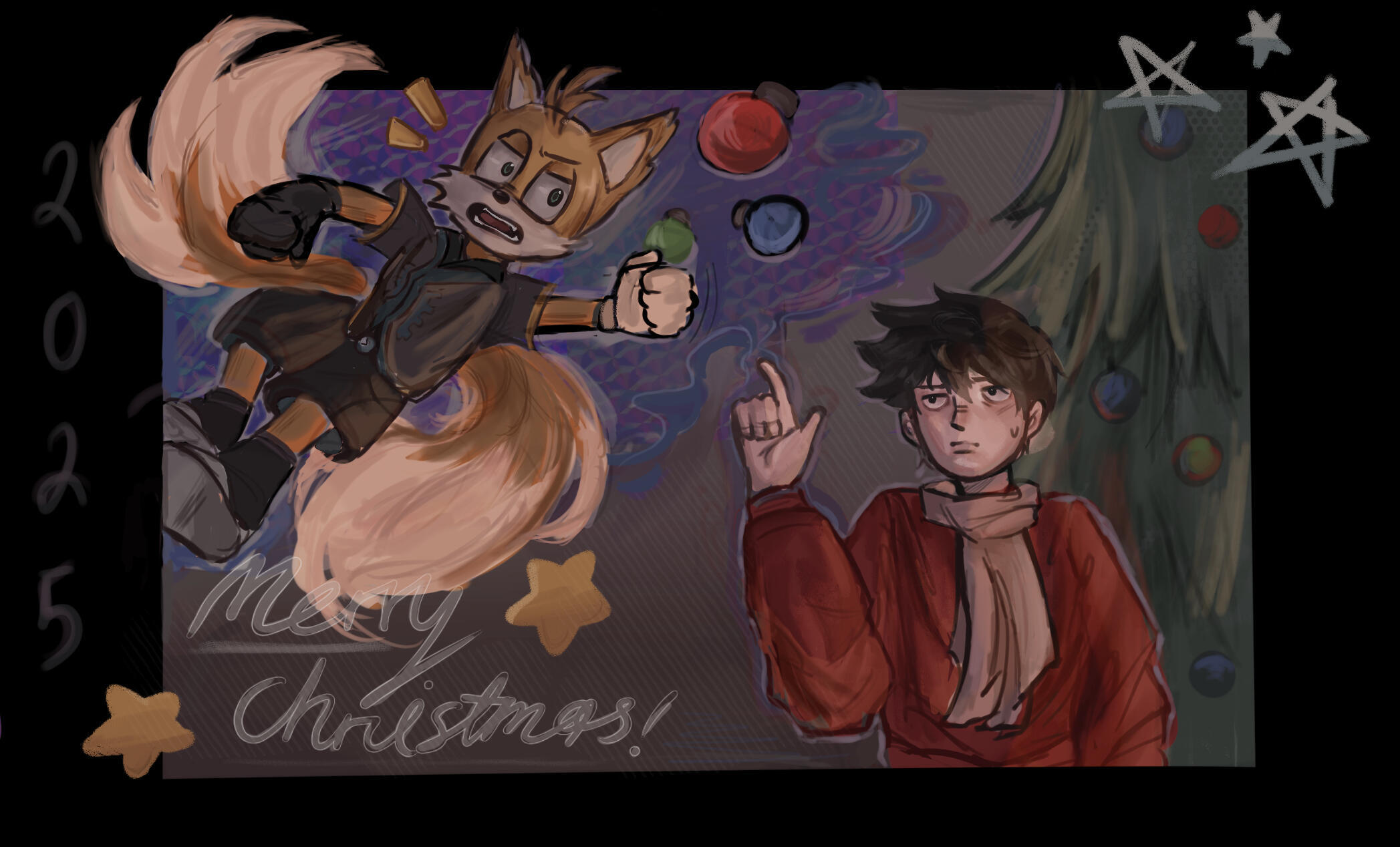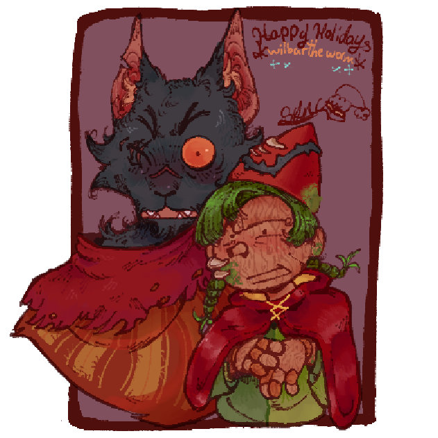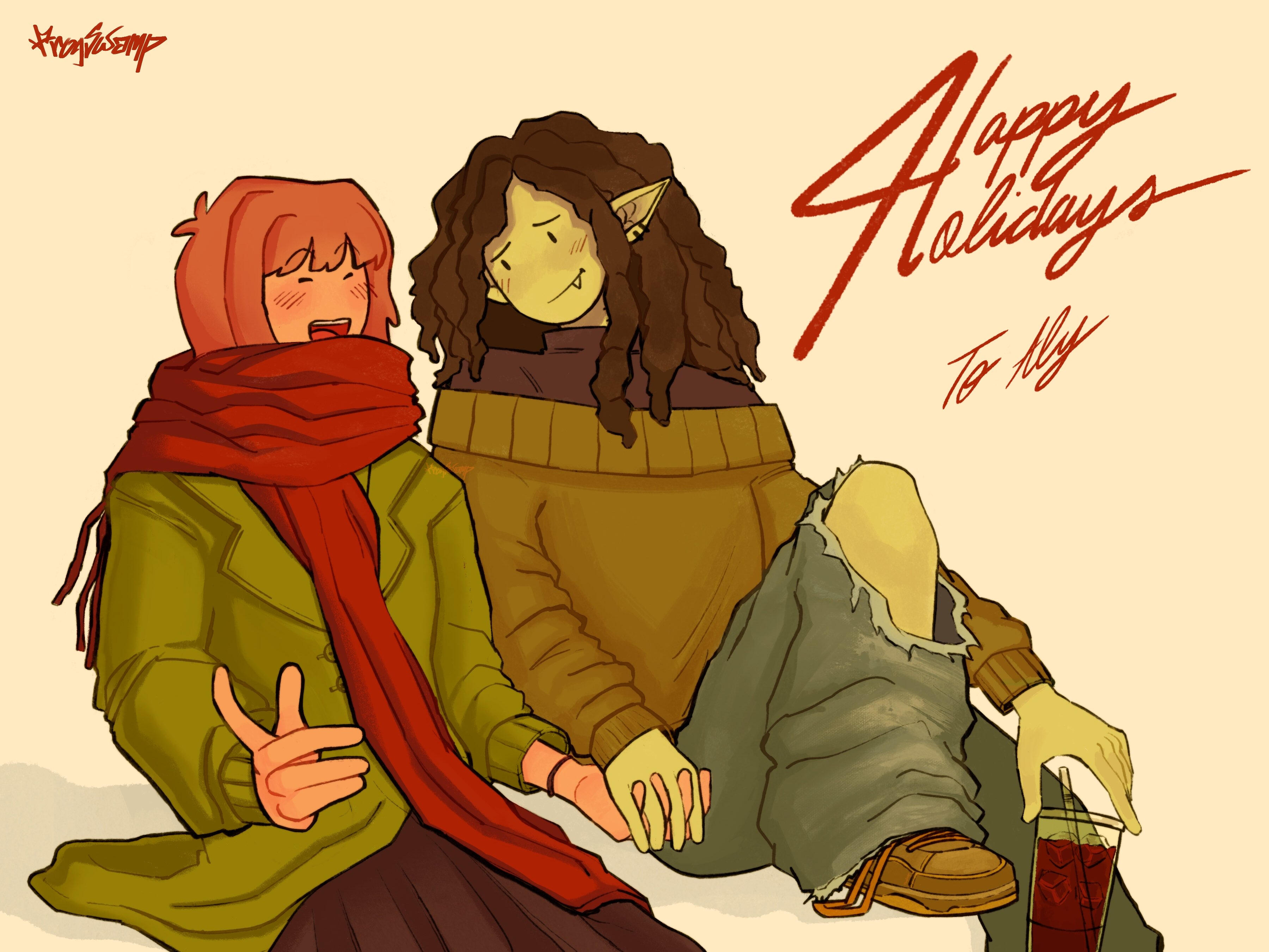 A drawing of my ocs sitting by a fire or a tree, one of my favorite characters in something normally worn on Christmas (Santa hat, sweater etc.)
