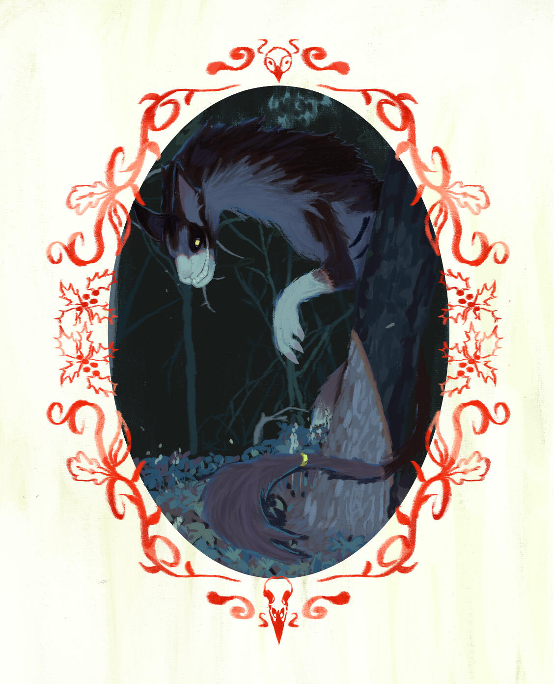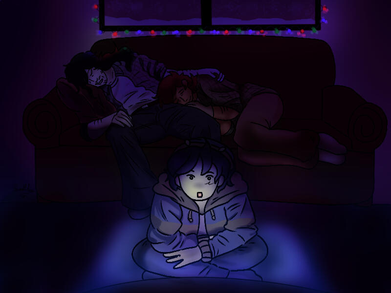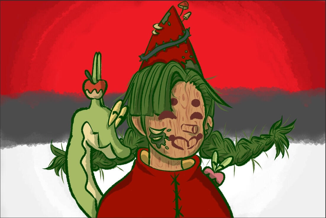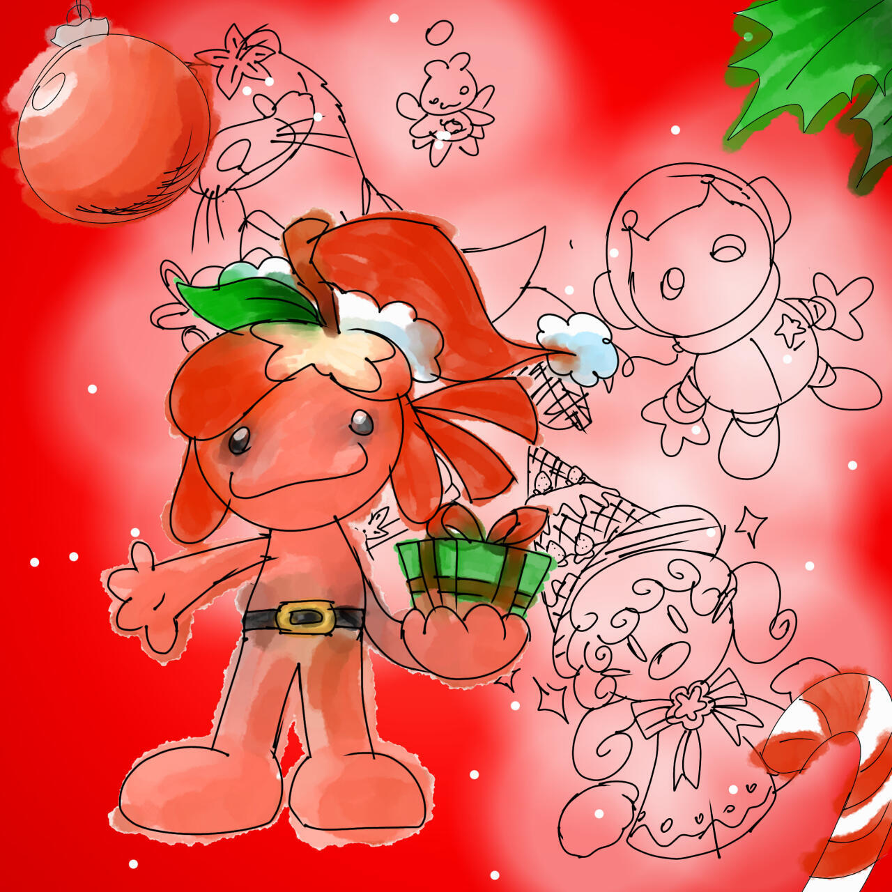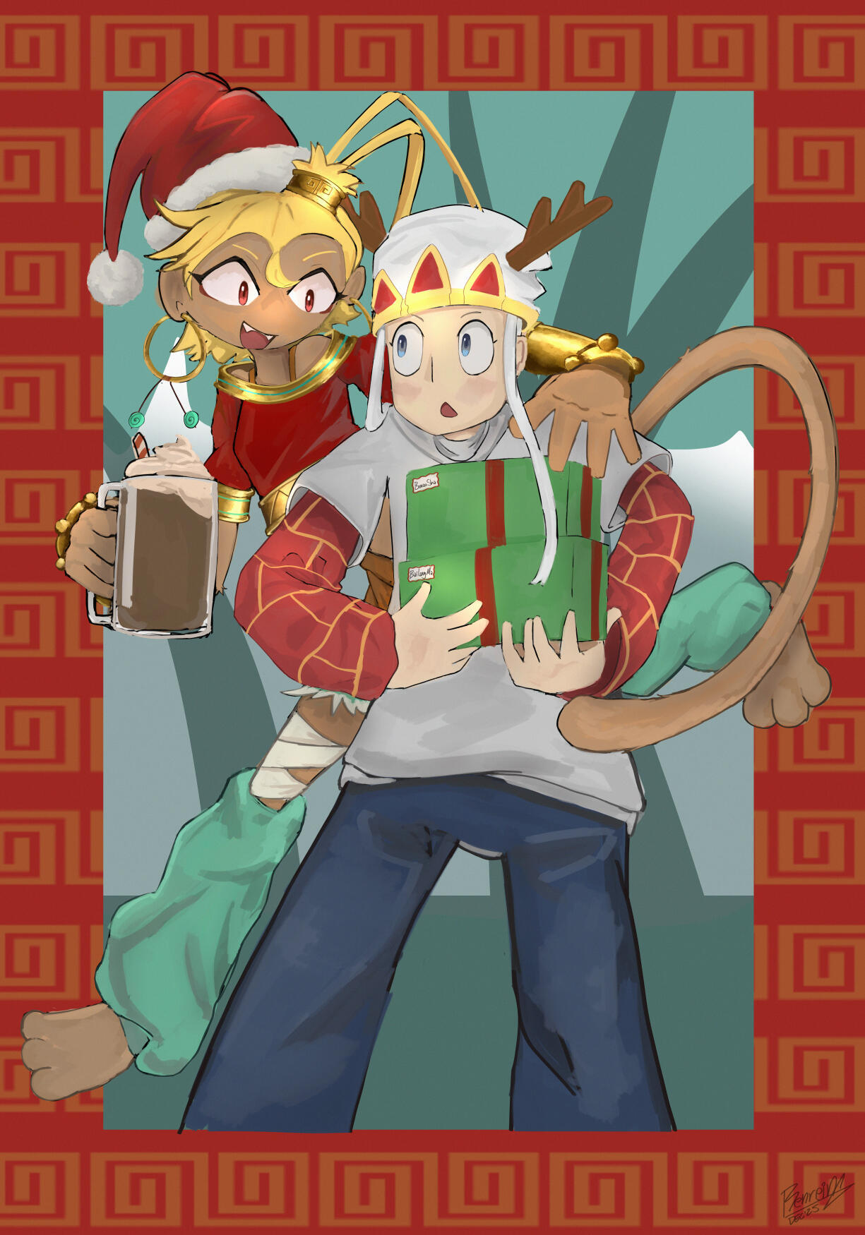 A drawing of my ocs sitting by a fire or a tree, one of my favorite characters in something normally worn on Christmas (Santa hat, sweater etc.)