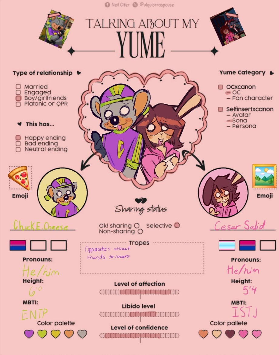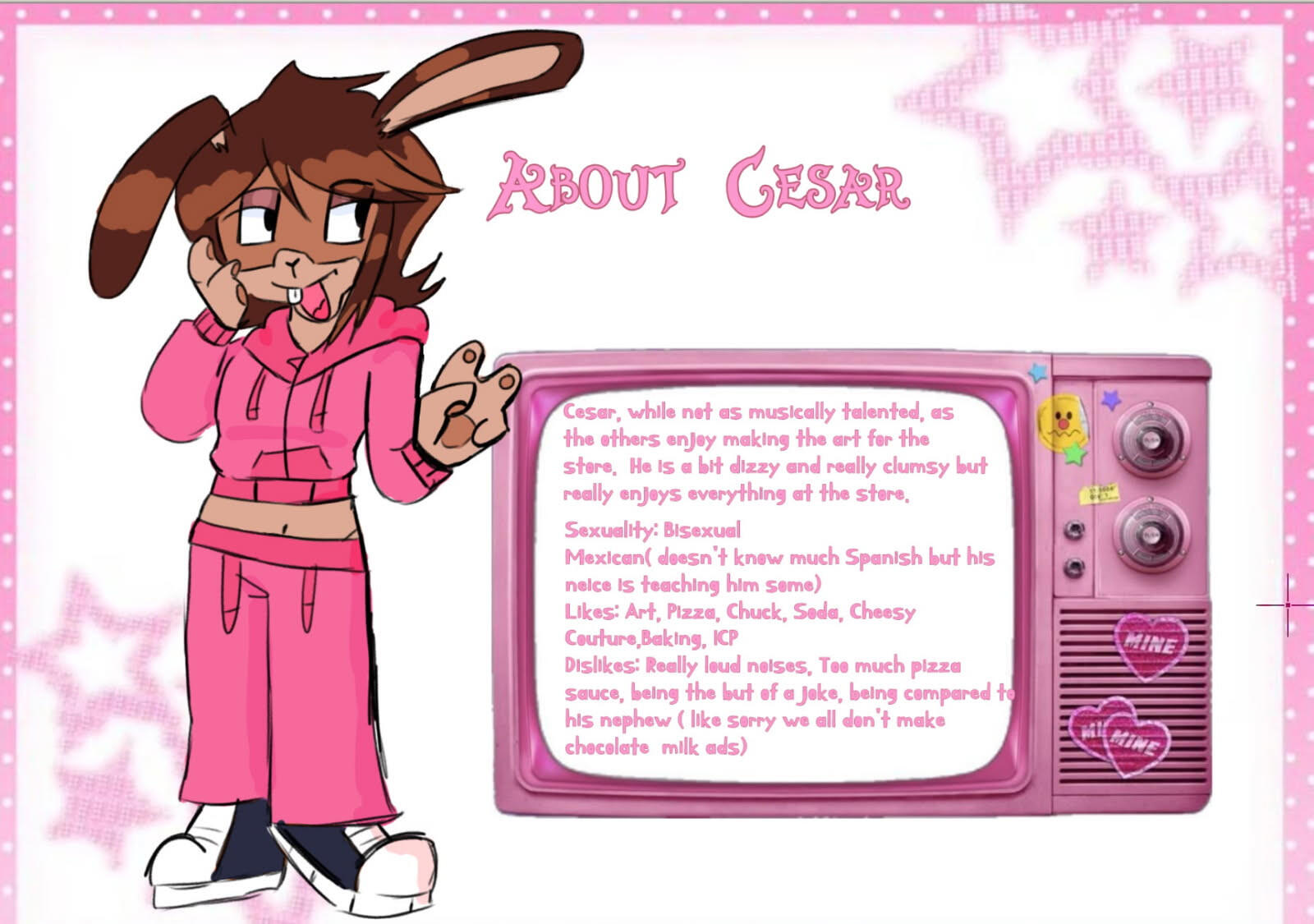 Cesar is my chuck e cheese oc he made the background art for the place. Seem confident but is generally rather quiet. I ship him with Chuck.